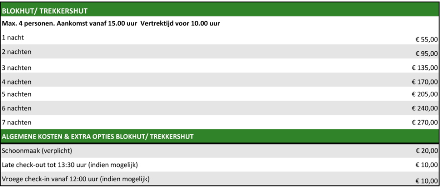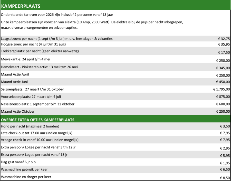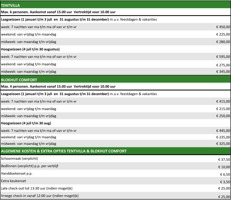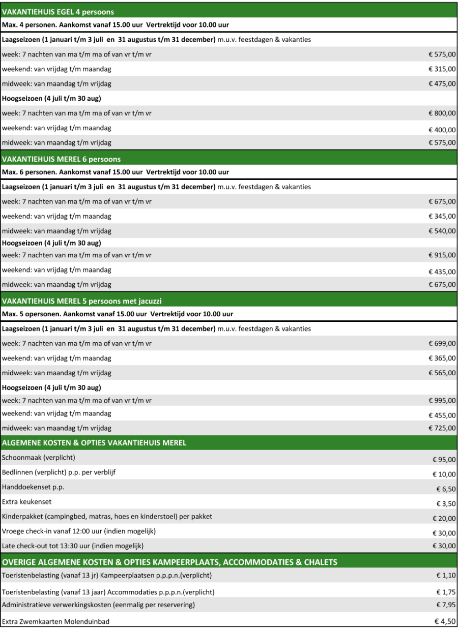 Prijzen zijn onder voorbehoud van eventuele prijswijzigingen van overheden. Bospark Langeloërduinen behoudt het recht deze eventuele prijswijzigingen aan u door te berekenen gedurende het jaar. Wij hanteren de meest recente Recron voorwaarden.