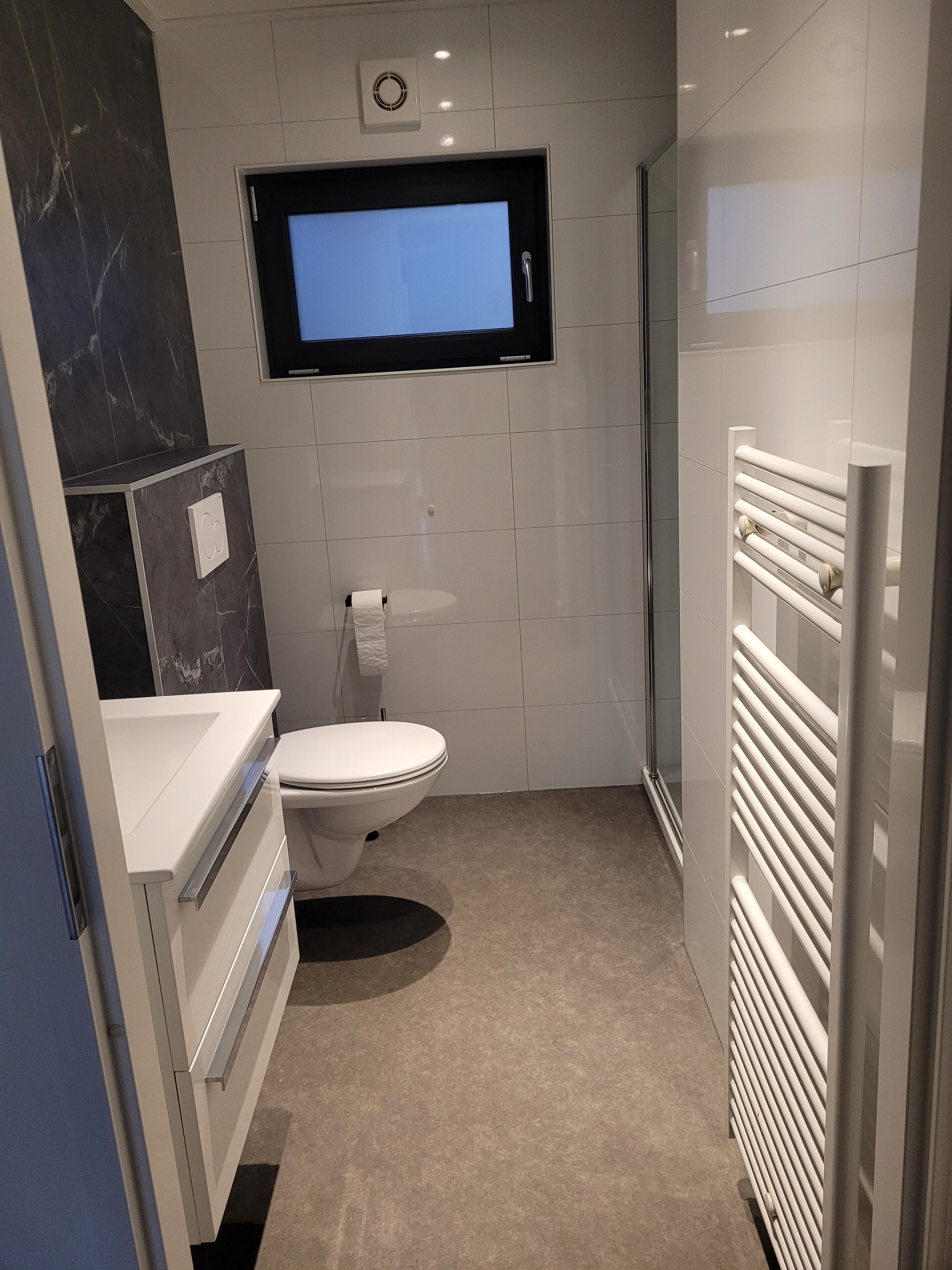 2 badkamers met inloop douche, toilet, wastafel en handdoek radiator
